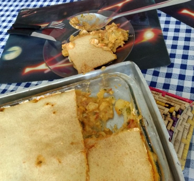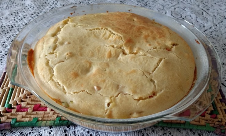 Coloque num pirex um pouco de massa, o recheio, e o resto da massa.